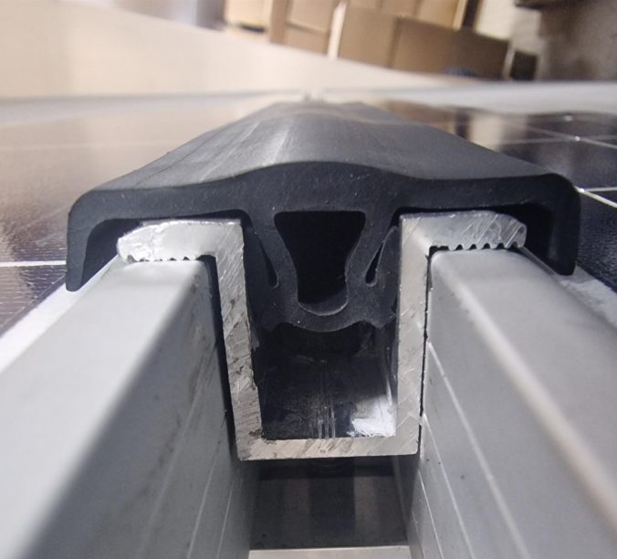 Produkowaną przez nas uszczelkę typu T stosuję się do uszczelniania połączeń modułów konstrukcji wiat fotowoltaicznych, tzw. „carportów”. Profile zabezpieczają szczeliny pomiędzy krawędziami paneli fotowoltaicznych, doskonale chroniąc wiaty z nich wykonane przed przeciekaniem wody. Nasze uszczelki wykonane są z elastycznego tworzywa TPV, które charakteryzuje się dużą elastycznością i odpornością na warunki atmosferyczne – produkt dobrze znosi temperatury sięgające nawet 100 °C. W przeciwieństwie do „gumy” – nie parcieje z upływem czasu. Montaż nie wymaga klejenia ani zgrzewania.